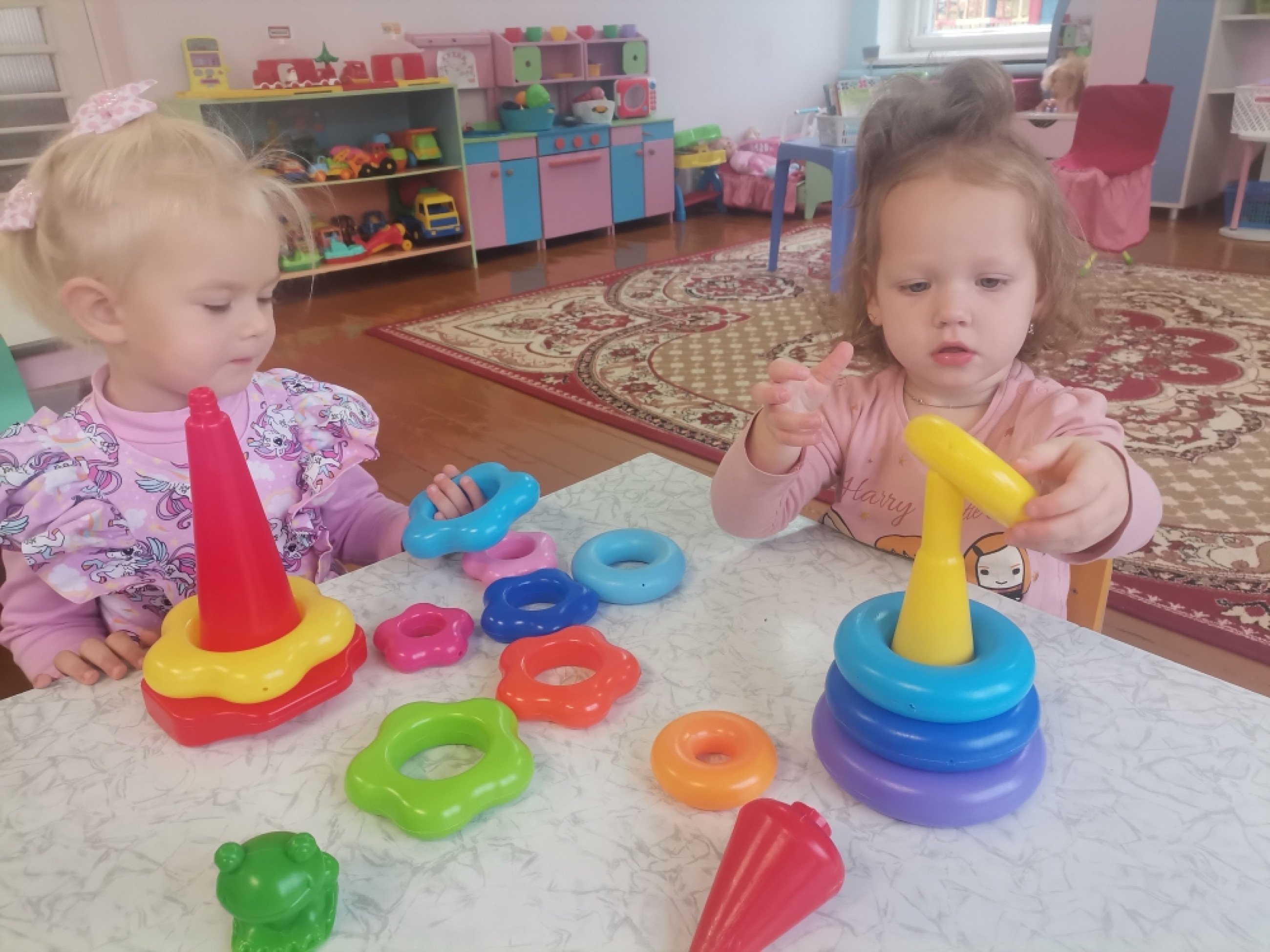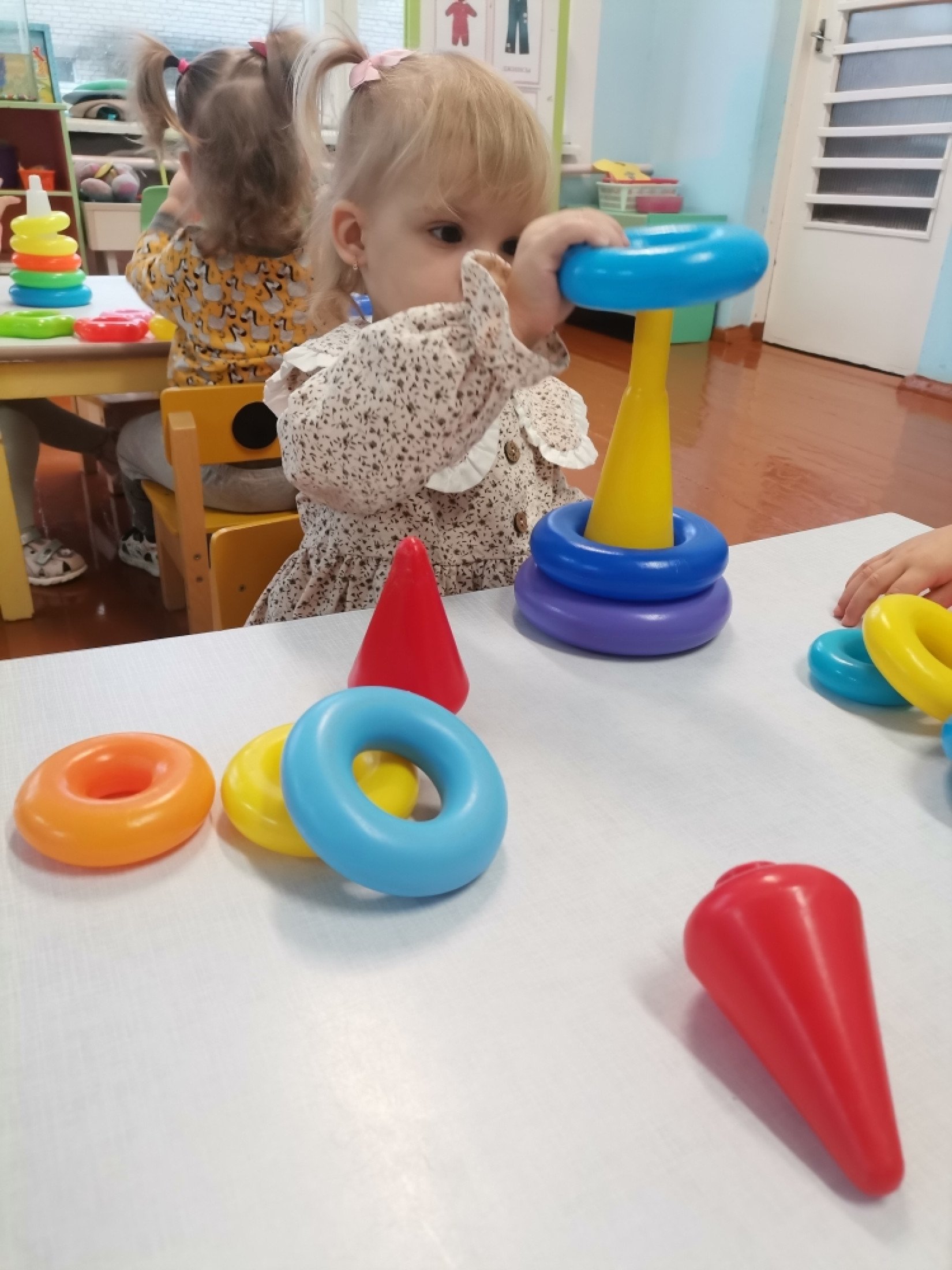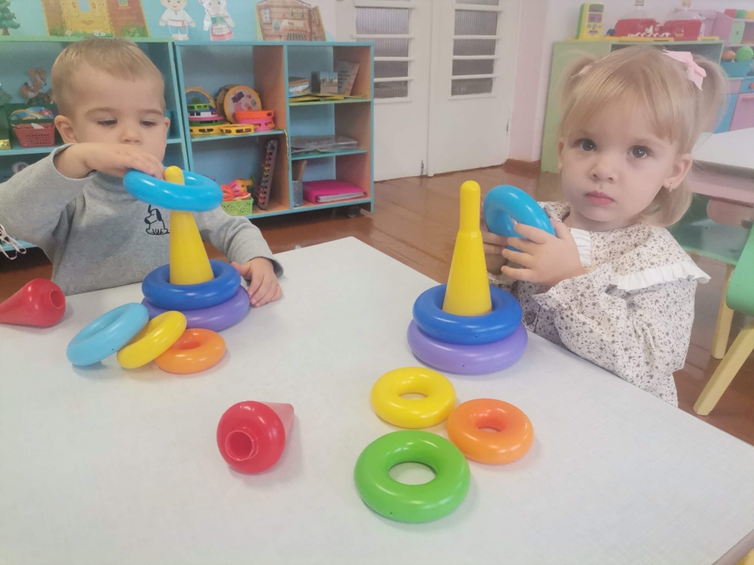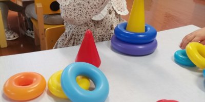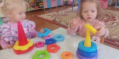 Воспитанники группы второго раннего возраста с большим удовольствием играют в различные игры. Вот и сегодня обучающиеся играли с пирамидками. Снимали и нанизывали на стержень кольца с отверстием. Развивались мелкую моторику. Самостоятельно и с помощью педагога собирали пирамидку из разноцветных колец от большого к маленькому.
