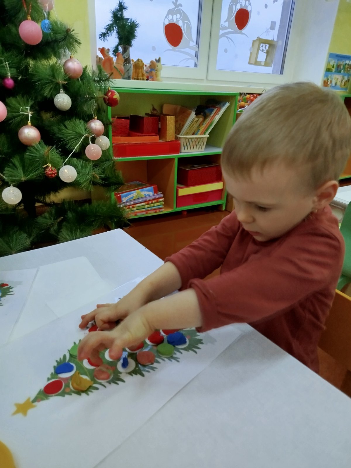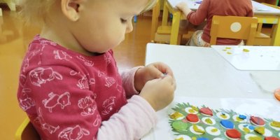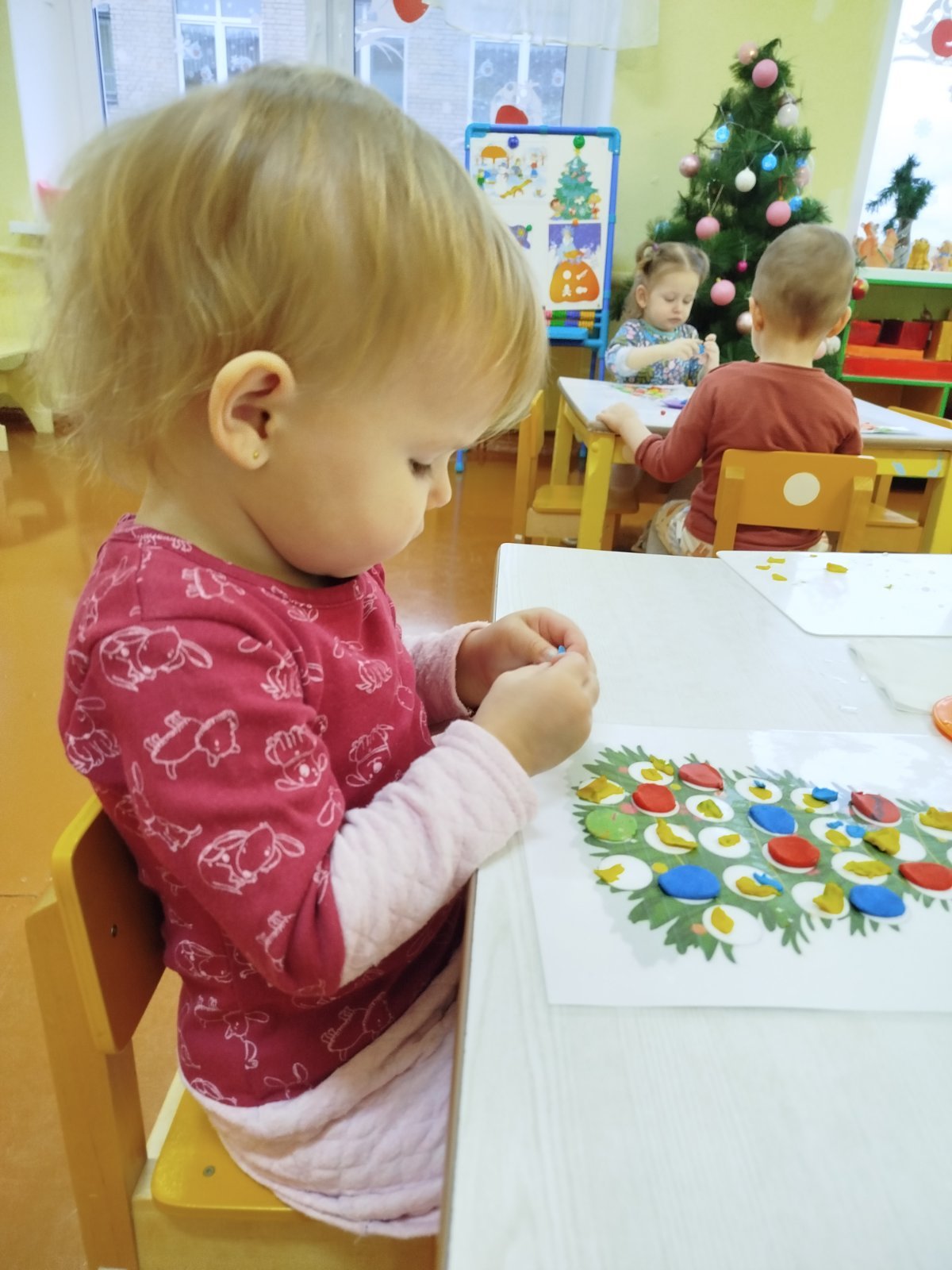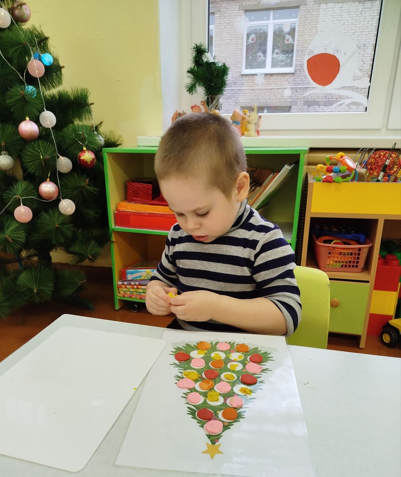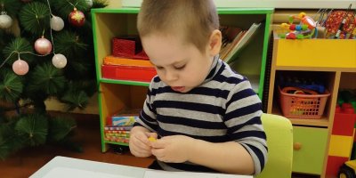 Главным символом Нового года является ёлка, которую с радостью украшали наши воспитанники. В процессе лепки ребята увлеченно отщипывали разноцветные кусочки пластилина для украшения ёлки. С интересом расплющивали комочки на основе развивая свой глазомер и координацию движений пальцев рук.